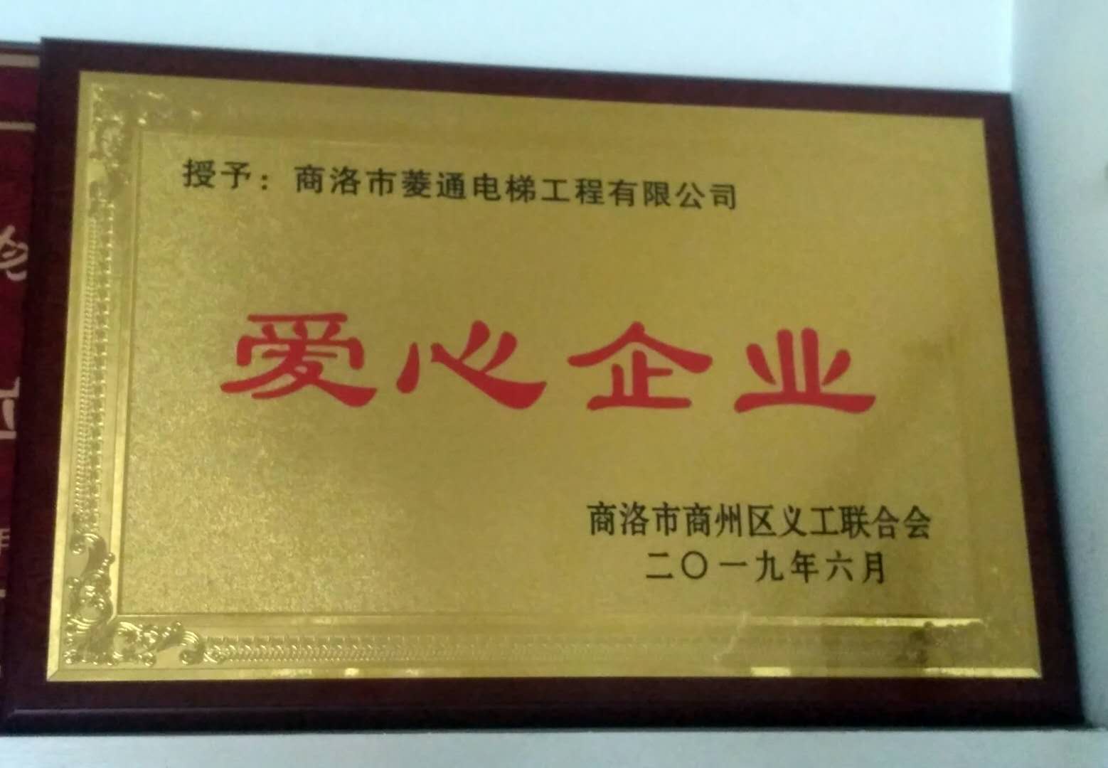 商洛市商州區(qū)義工聯(lián)合會(huì)授予:商洛市菱通電梯工程有限公司愛(ài)心企業(yè)獎(jiǎng)牌一個(gè)